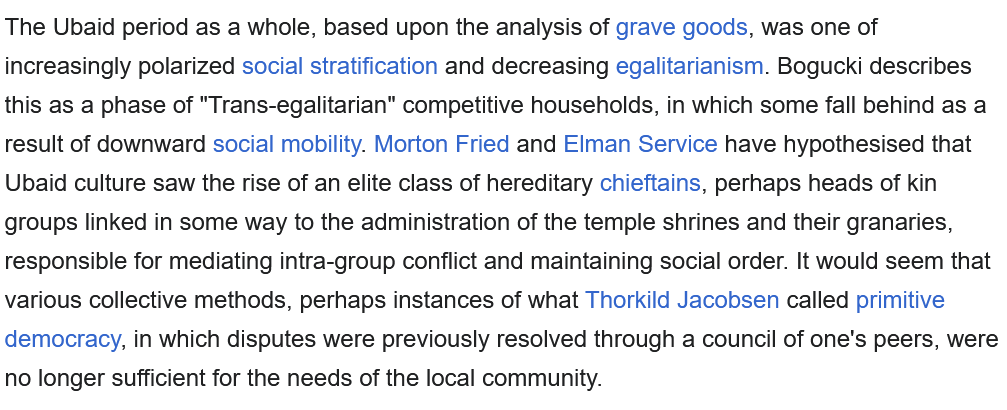 Even the earliest known civilization, Sumer, suffered the socially-stratifying effects of a large population. “The Ubaidians, though never mentioned by the Sumerians themselves, are assumed by modern-day scholars to have been the first civilizing force in Sumer.”